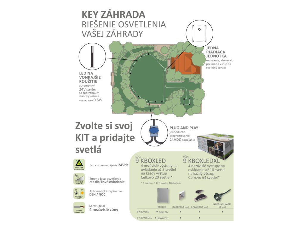 Kit GARDEN BOX pro ovládání 20 zahradních světel KEY. Kit obsahuje: elektroniku (BOXLED), noční senzor (QUADRO), 2x ovladač (KPLAY4R), napájecí kabel.