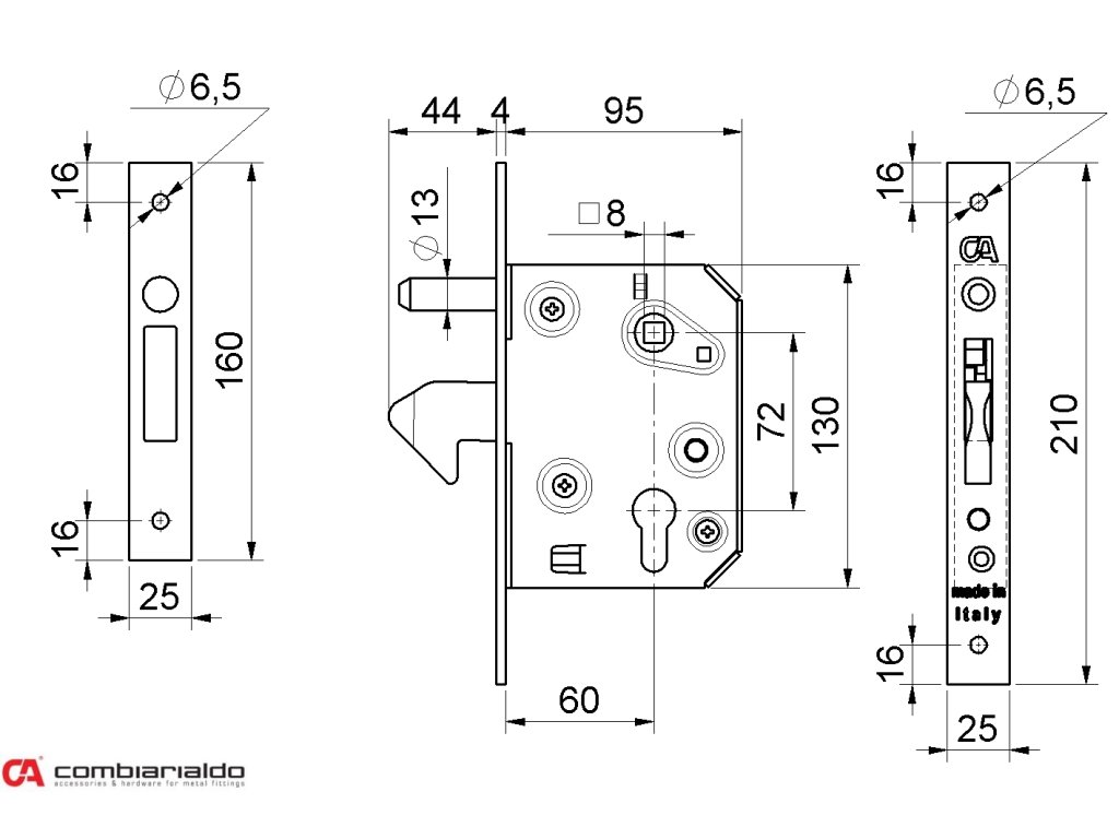 Standardizovaná rozteč 72 mm umožňuje snadnou instalaci do většiny rámů posuvných bran, zajišťuje kompatibilitu s běžně dostupnými kováním a dalšími zámkovými systémy. S hloubkou zádlabu 95 mm poskytuje dostatečnou pevnost a stabilitu zámku v rámu brány, což zajišťuje jeho odolnost a bezpečnost při opakovaném používání.