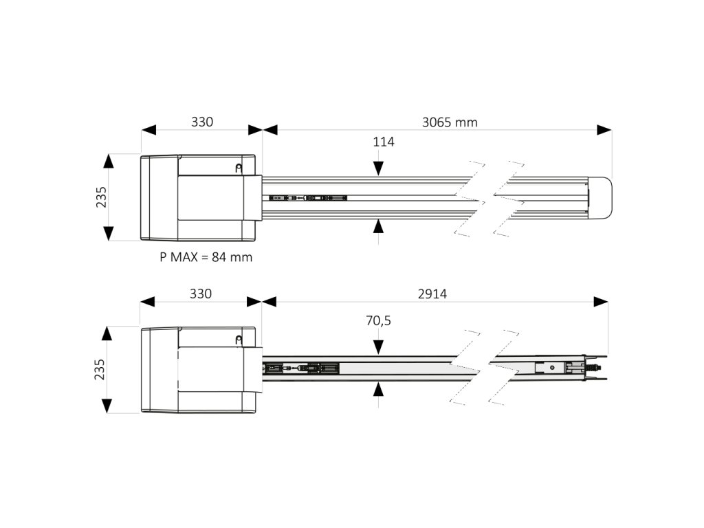 - Stejná hlava pohonu pro vodicí lišty s LED a bez LED.