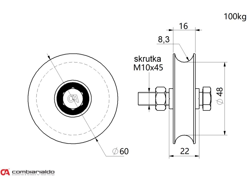 Kolečko o průměru 60mm se šroubem, jednoložiskové Combi Arialdo, C902/16 profil, nosnost 100kg