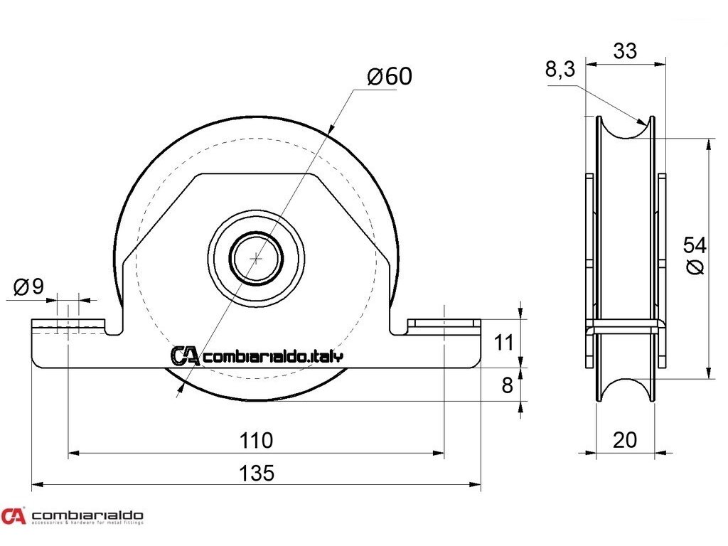 Kladka o průměru 60mm pro zapuštění do jeklu, jednoložisková Combi Arialdo, nosnost 190kg
