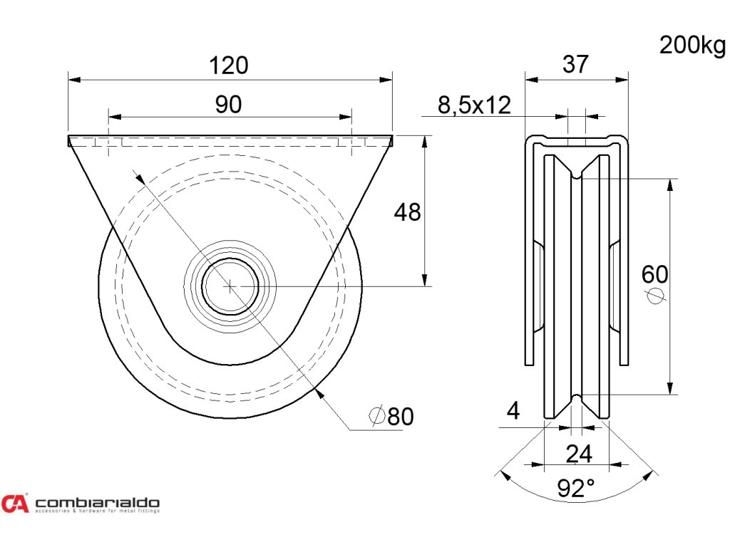 Kladka o průměru 80mm s oporou, jednoložisková Combi Arialdo, V profil, nosnost 200kg
