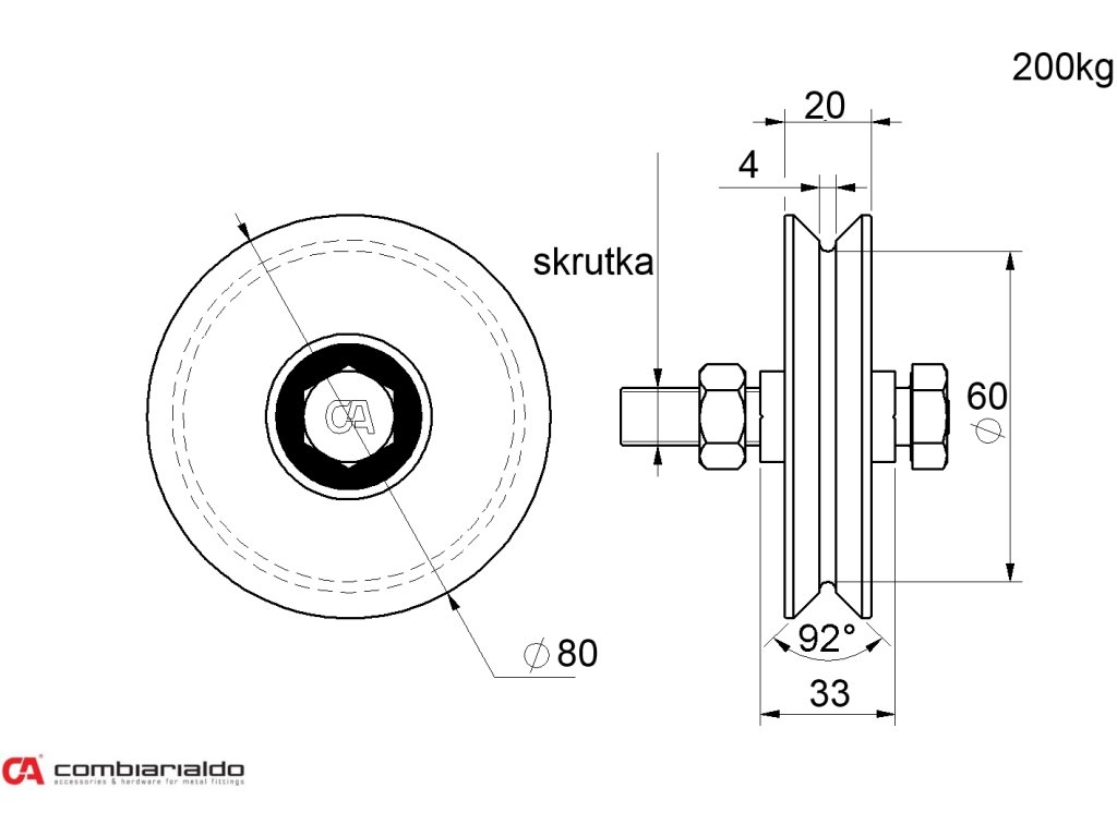 Kolečko o průměru 80mm se šroubem, jednoložiskové Combi Arialdo, V profil, nosnost 200kg