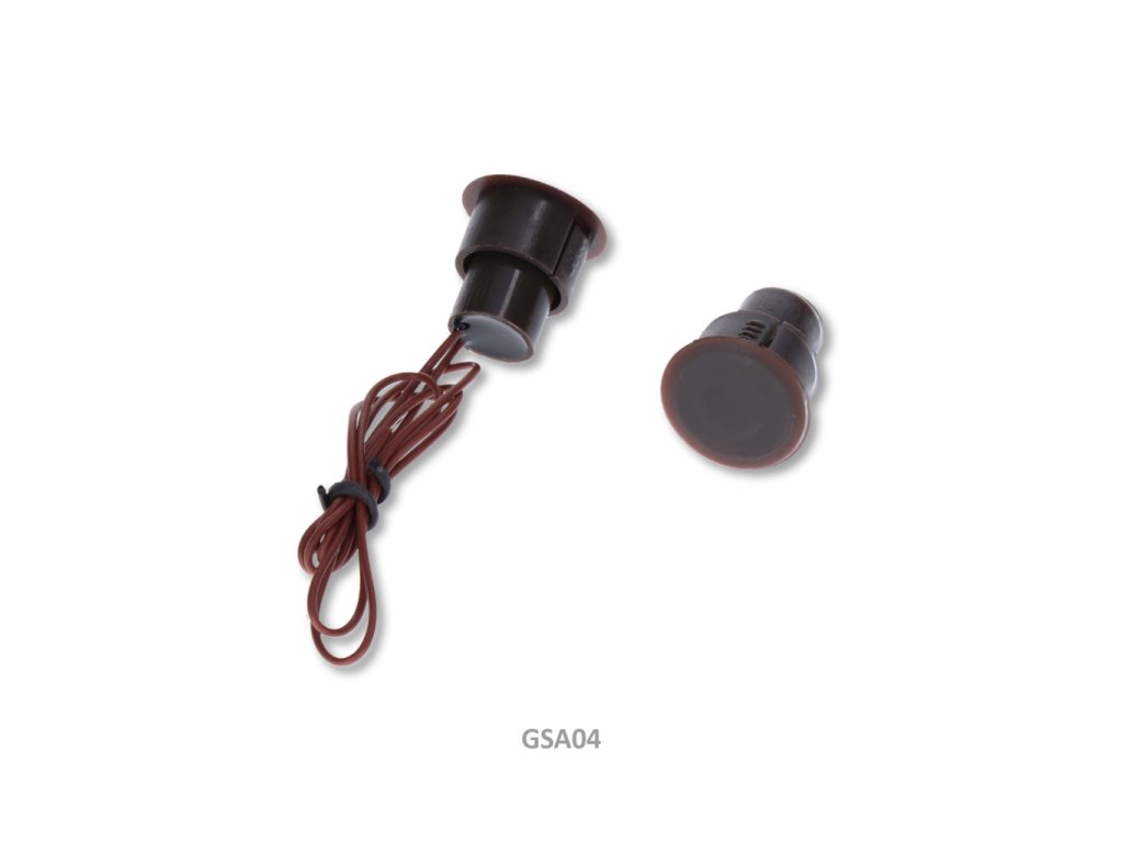 Magnetický spínač (kontakt) válcového tvaru určený pro zapuštění např. do rámu dveří. Vodotěsný.