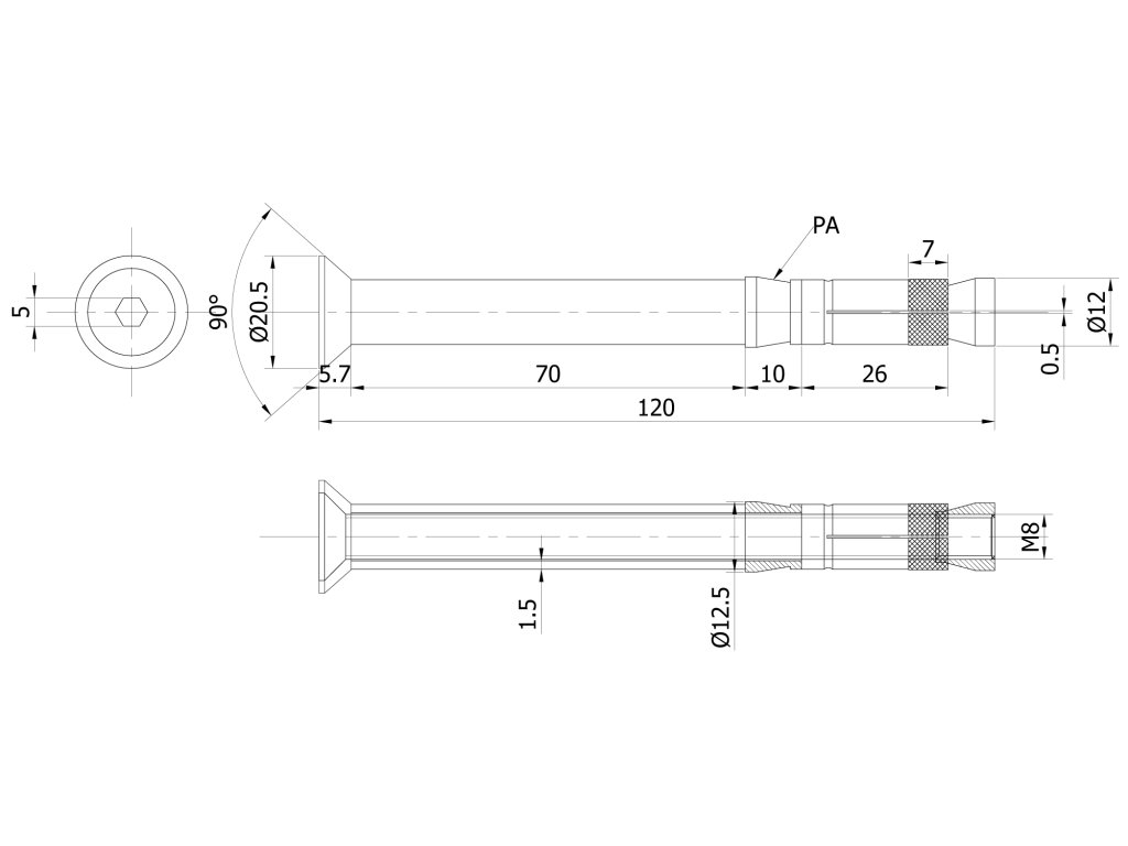 Nerezová kotva pro hliníkový profil AISI304, hlava na 6mm imbus