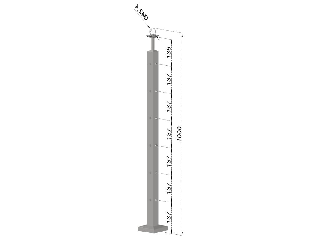 Nerezový sloup, vrchní kotvení, 6 děrový rohový, vrch pevný, (40x40 mm), broušená nerez K320 / AISI304
