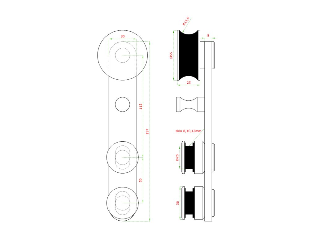 Pojezdový vozík k vodicímu profilu 25mm pro závěsný systém, broušená nerez K320 / AISI304