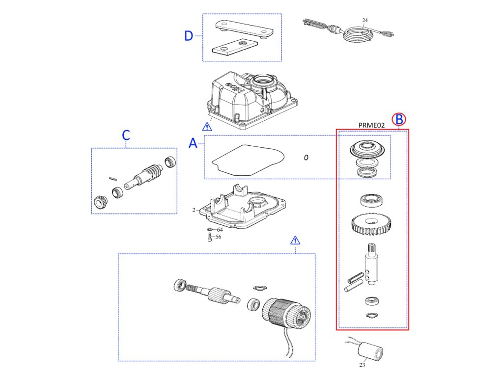 PRME02 kit pro METRO3000R01/ME3010 kit výstupní hřídele převodovky s ložisky a guferem pro METRO3000 / 3024/3010, obsahuje: 14,15,16,26,27,32,33,44,47