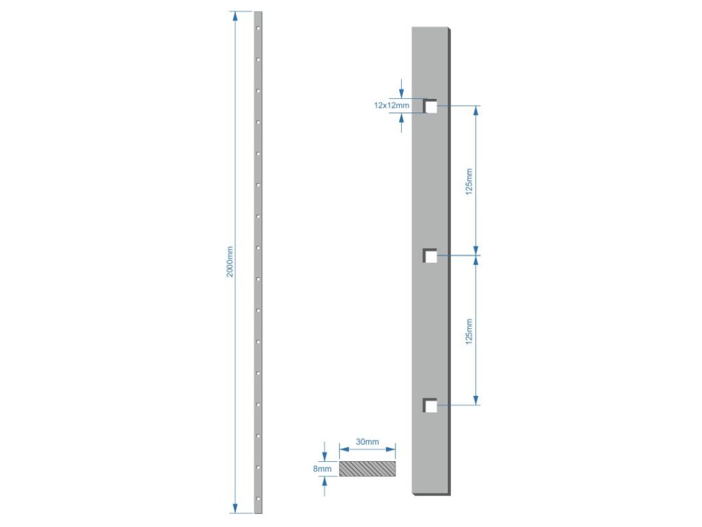 Probíjená tyč 30 x 8 mm, rozteč děr 125 mm, otvor ? 12 x 12 mm, 2000 mm