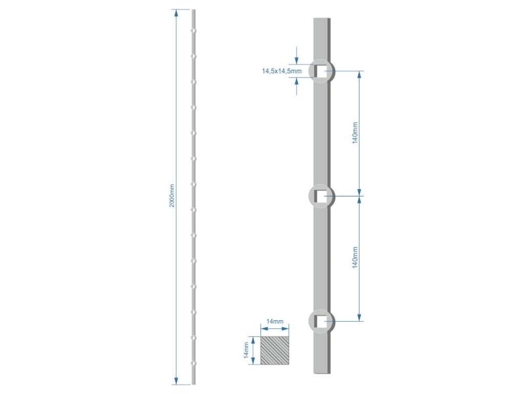 Probíjená tyč délky 2000 mm, opískovaná, profil 14 x 14 mm, rozteč děr 140 mm, oko 14,5 x 14,5 mm, na tyči je 14 děr