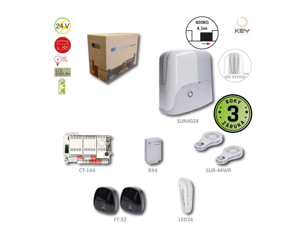 SUN KIT pro posuvnou bránu do 400kg, 1x SUN4024 (24V, 250W, 13Nm), 1x CT-14A, 2x SUB-44WR, 1x RX4, 1 pár FT-32, 1x LED24
